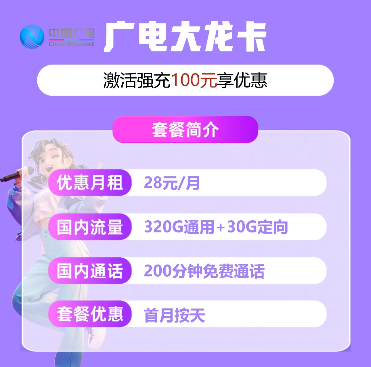 广电大龙卡(广电校园流量卡推荐),只需28元!350G流量+200分钟通话,全国通用无障碍。针对18-35岁用户,自主激活、发全国,告别繁琐步骤。更有贴心服务:关闭三个月语音功能,让沟通更自由。抓住机会,开启智能生活新篇章!