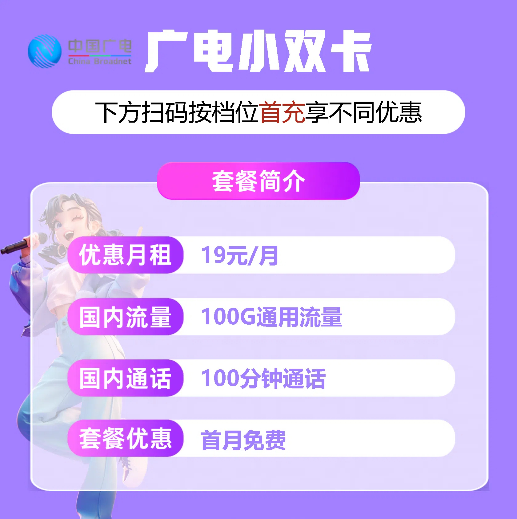 中国广电推出限时大流量套餐——19元享100G+100分钟通话!首月免费,流量自动结转至下个月。